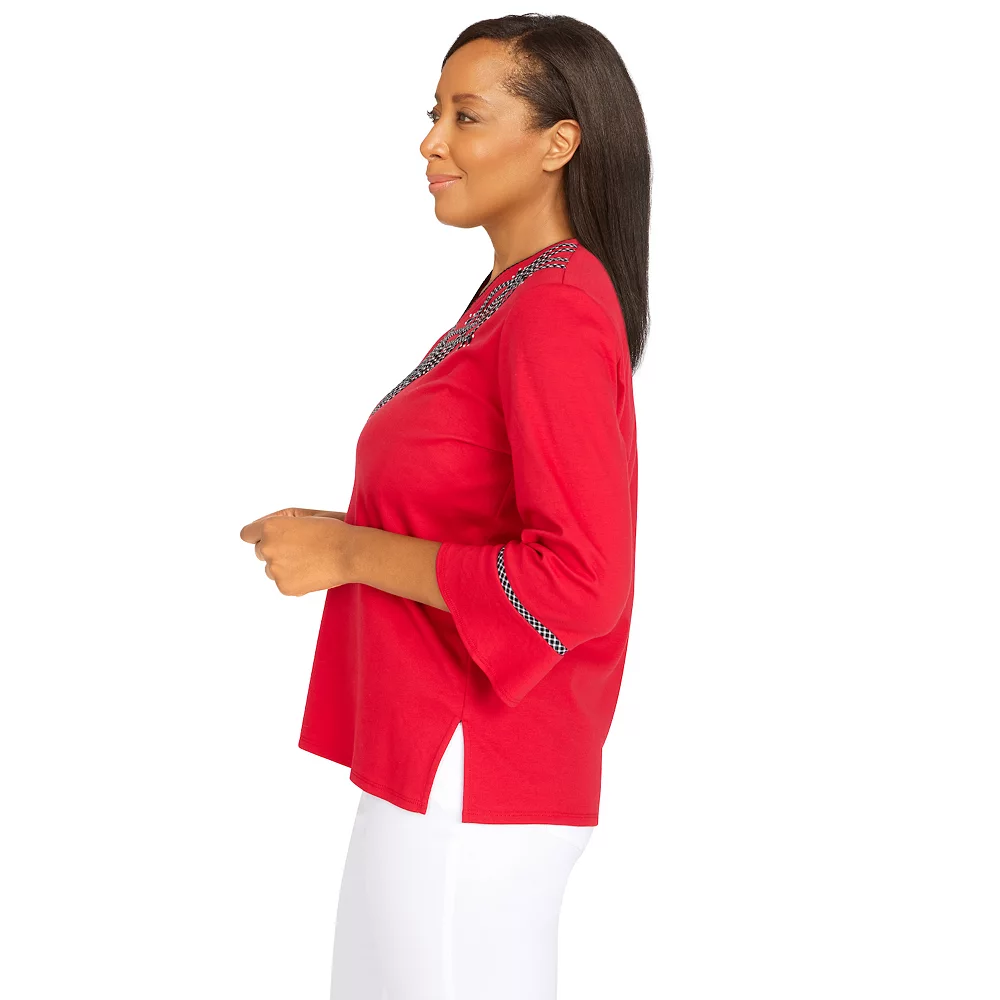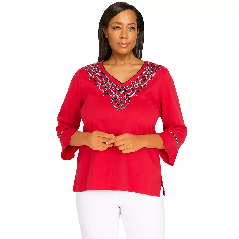 Beautiful, intricate scroll embroidery feminizes this women’s top from Alfred Dunner.
