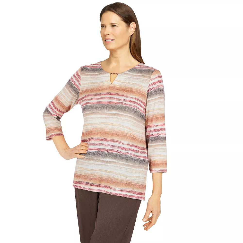 A warm rich color palette creates a tonal watercolor biadere on this women’s top from Alfred Dunner.