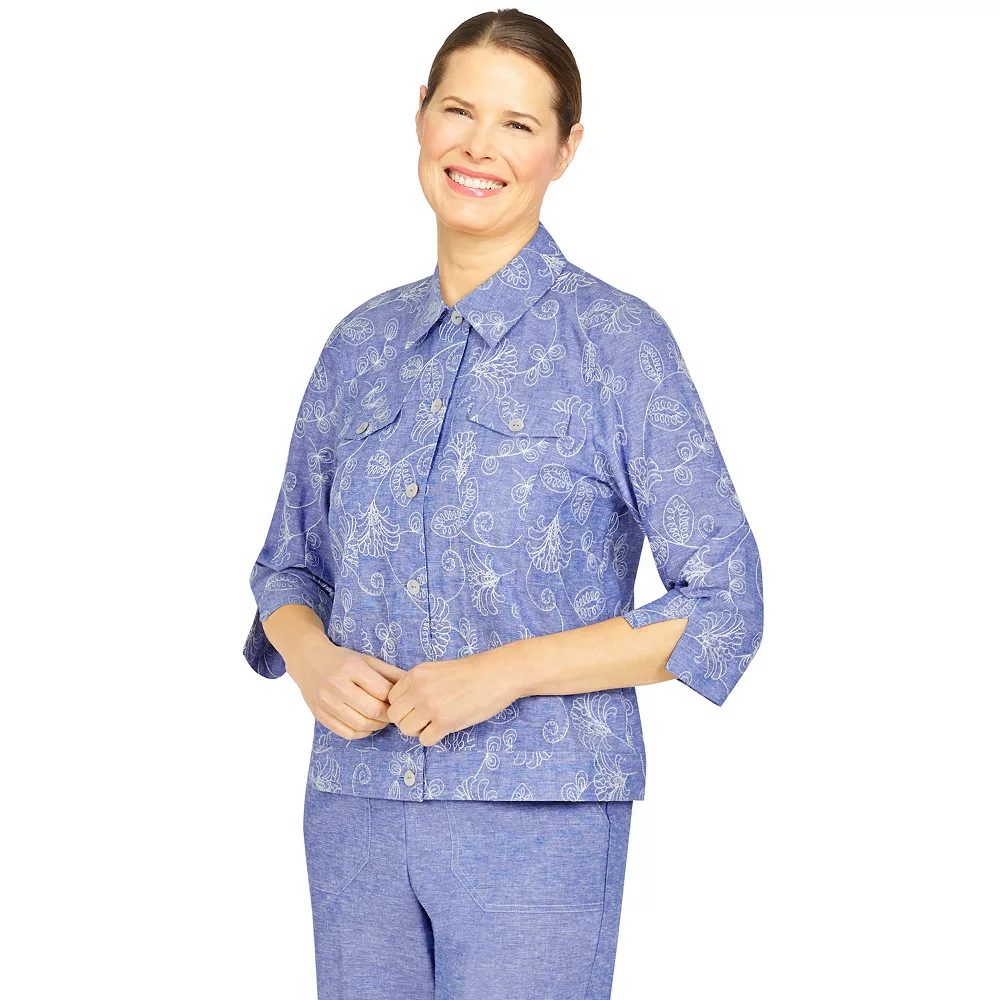 Simple but chic. You’ll love wearing this lightweight chambray women’s jacket from Alfred Dunner.