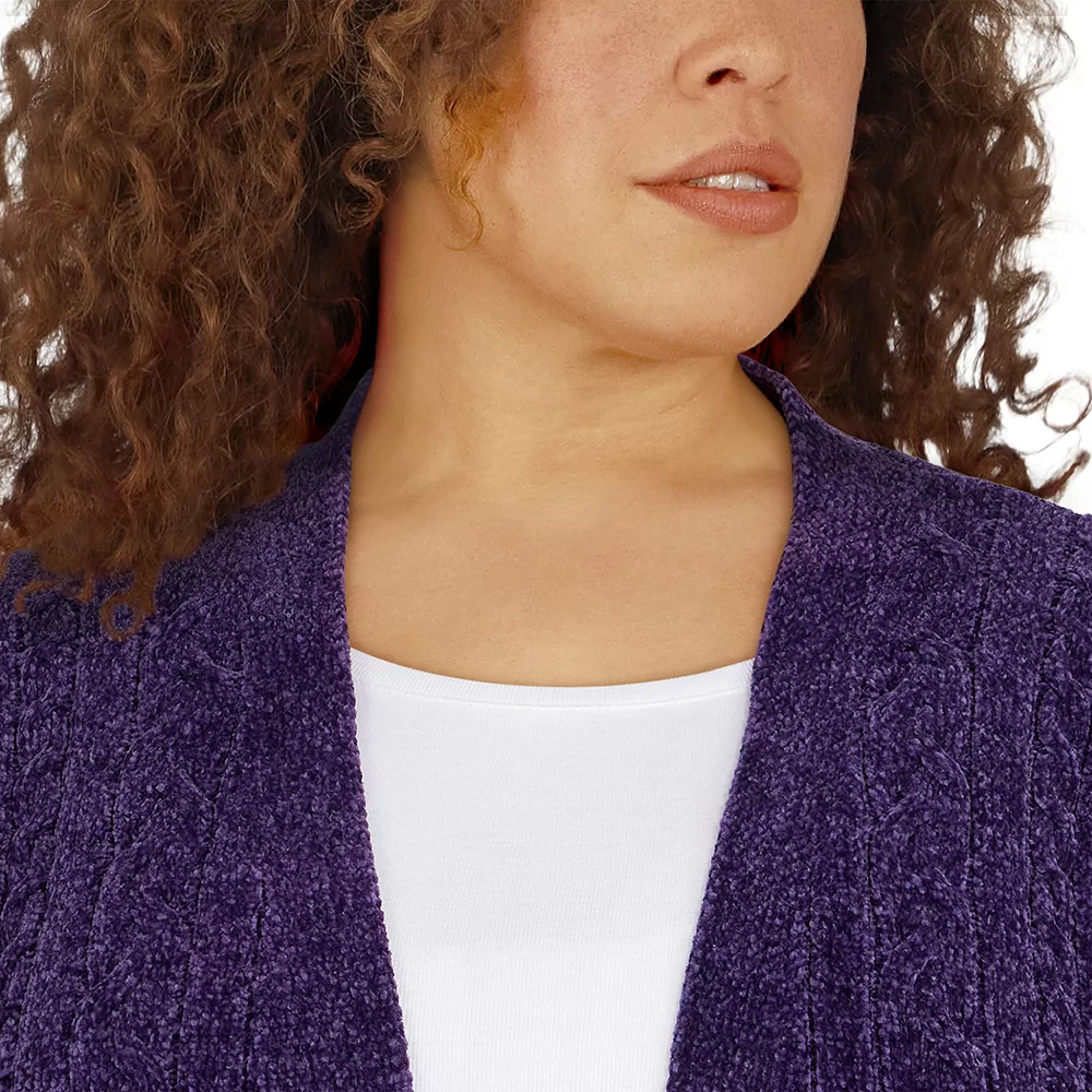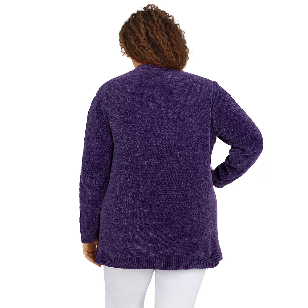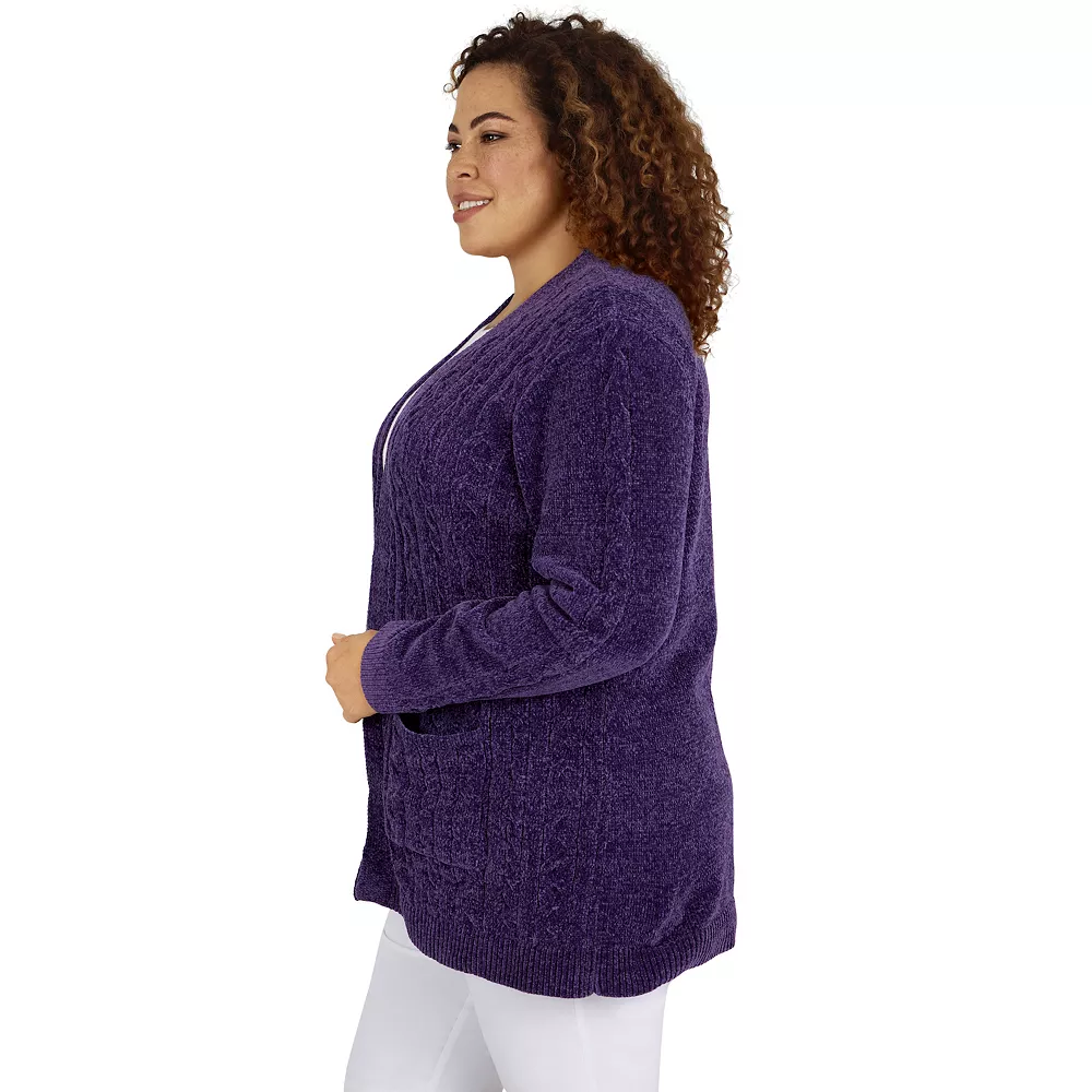 A cable stitch pattern creates textural interest on this women’s cardigan sweater from Alfred Dunner.