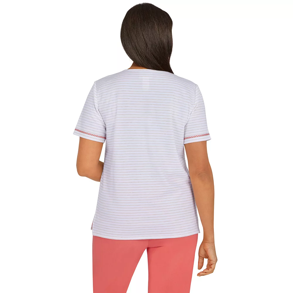 A whimsical embellished pineapple surrounded by tropical flowers will put you in a tropical state of mind with this women’s top from Alfred Dunner.