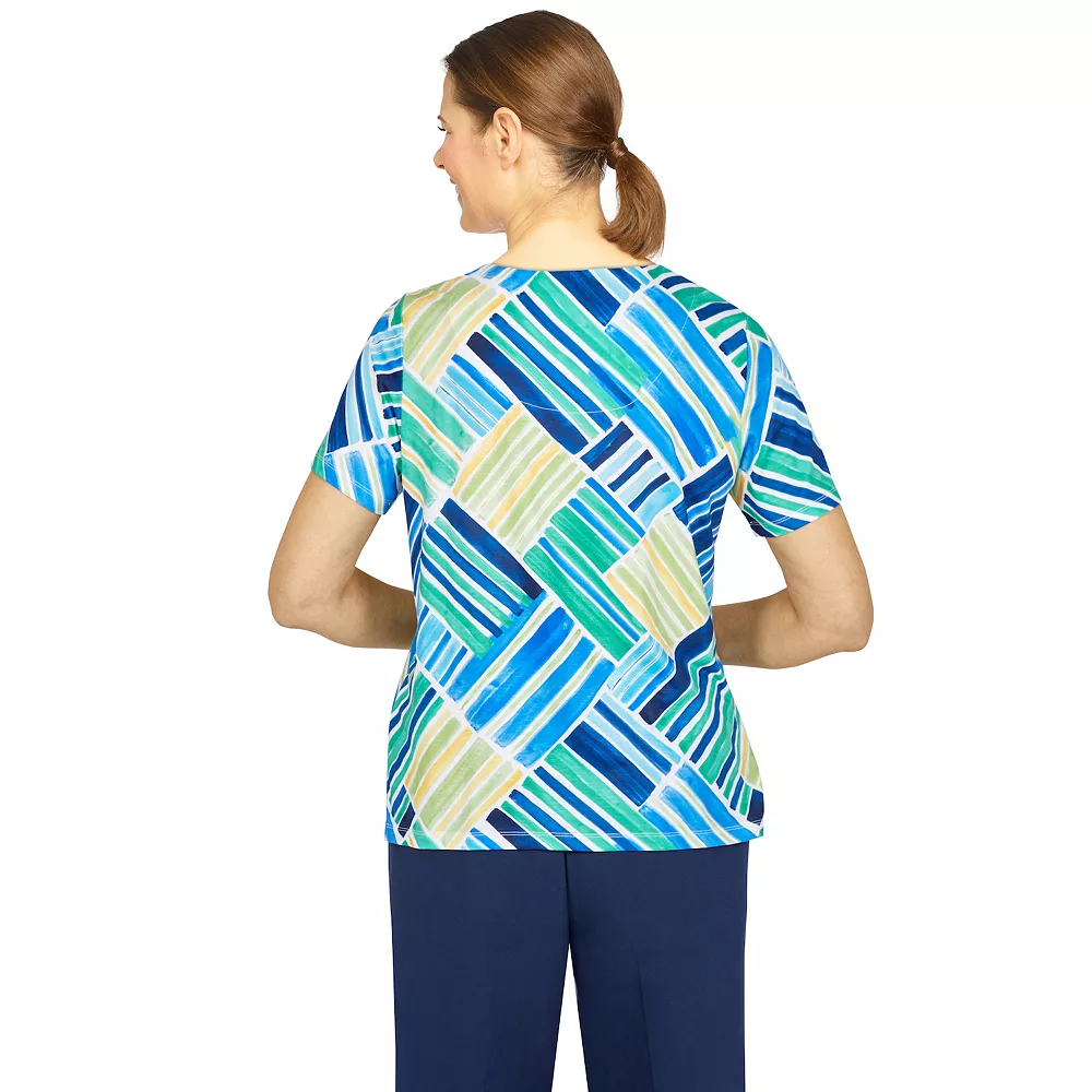 Watercolor stripes create an interesting patchwork print on this Alfred Dunner soft knit women’s short sleeve top.