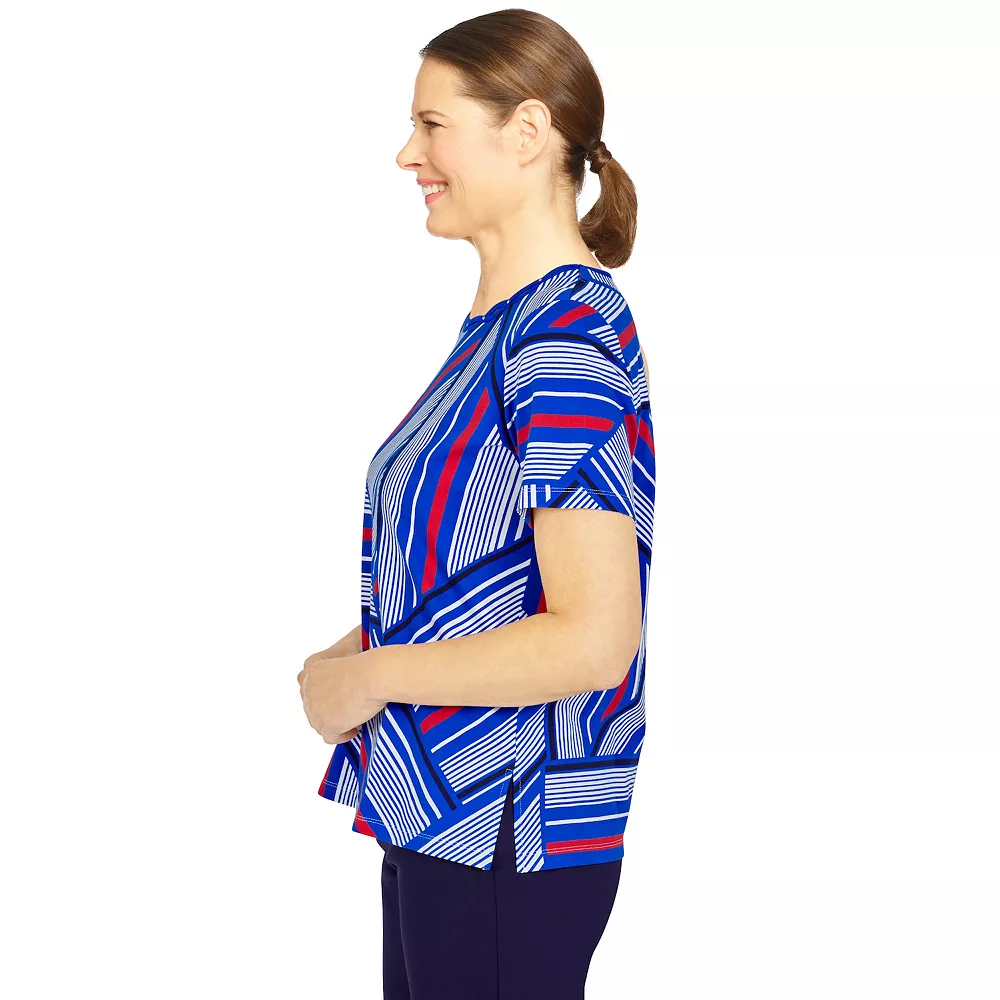 We the people’ love this spliced stripe women’s top from Alfred Dunner. A beaded braid detail at the crewneck adds a feminine flair to this bold look.