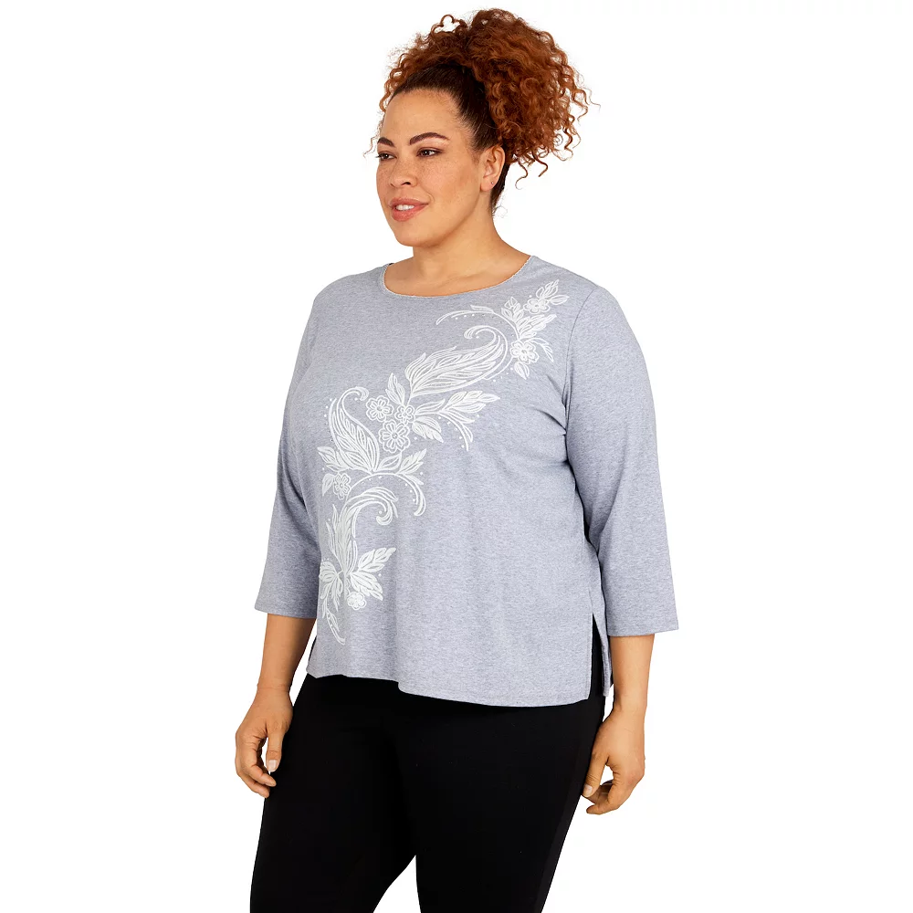 Exquisite floral leaf embroidery and embellishments grace this women’s top from Alfred Dunner.