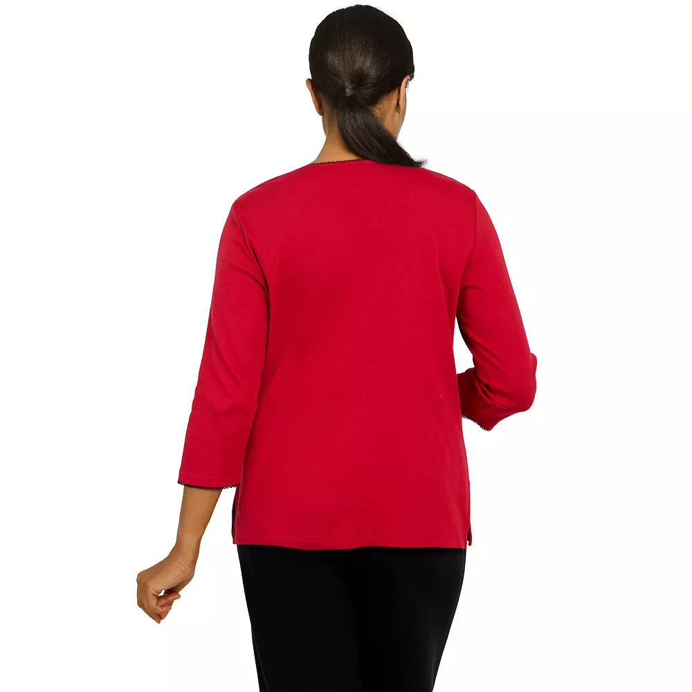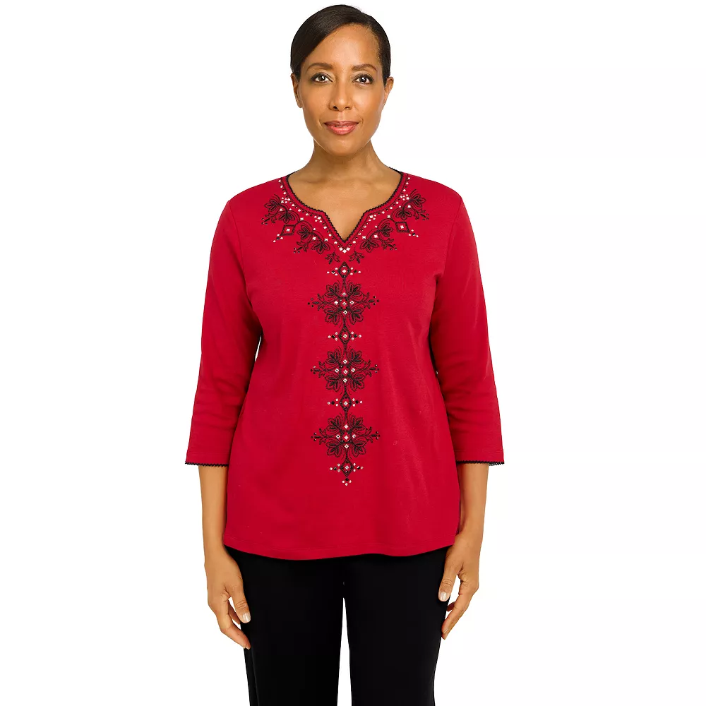 The beautiful intricate scroll embroidery feminizes this women’s top from Alfred Dunner.