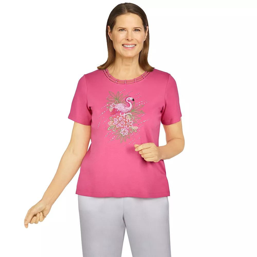 The embroidered and embellished flamingo takes center stage on this soft knit women’s top from Alfred Dunner. A double strap crew neckline with light beading tops off this tropical style.