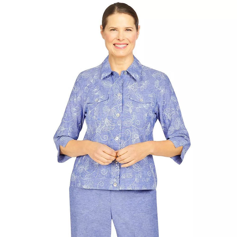 Floral and chic! You’ll love wearing this lightweight chambray women’s jacket from Alfred Dunner.