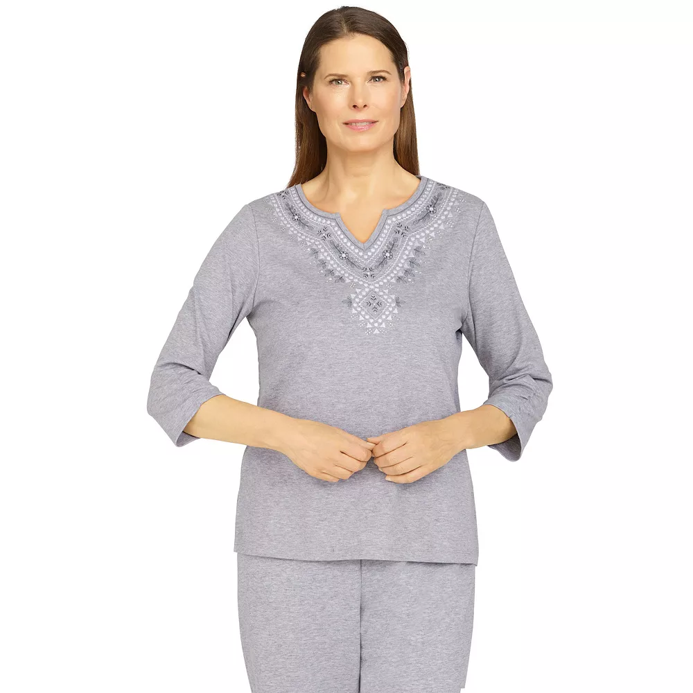 Pretty embroidery at the neckline on this women’s top from Alfred Dunner adds versatility.