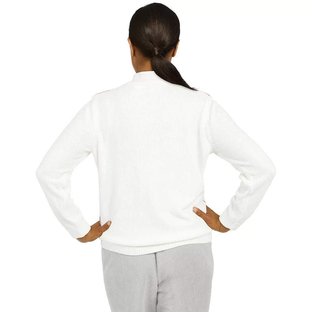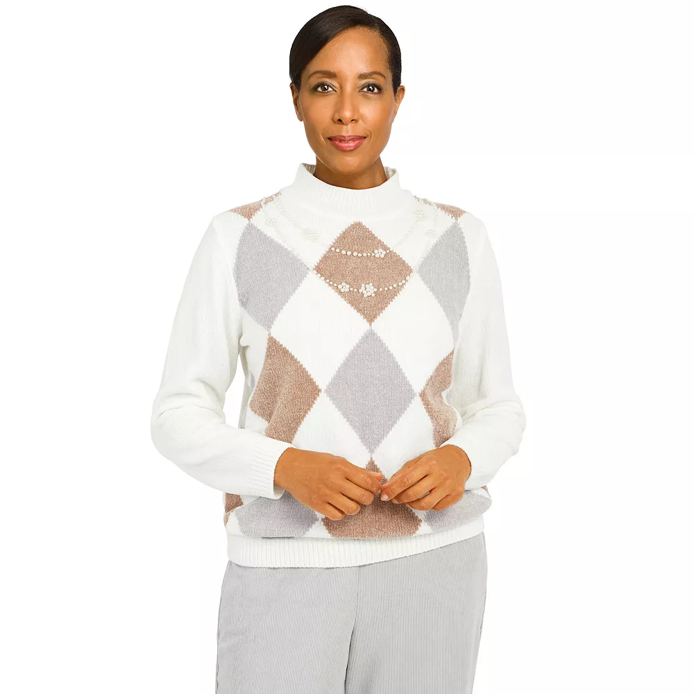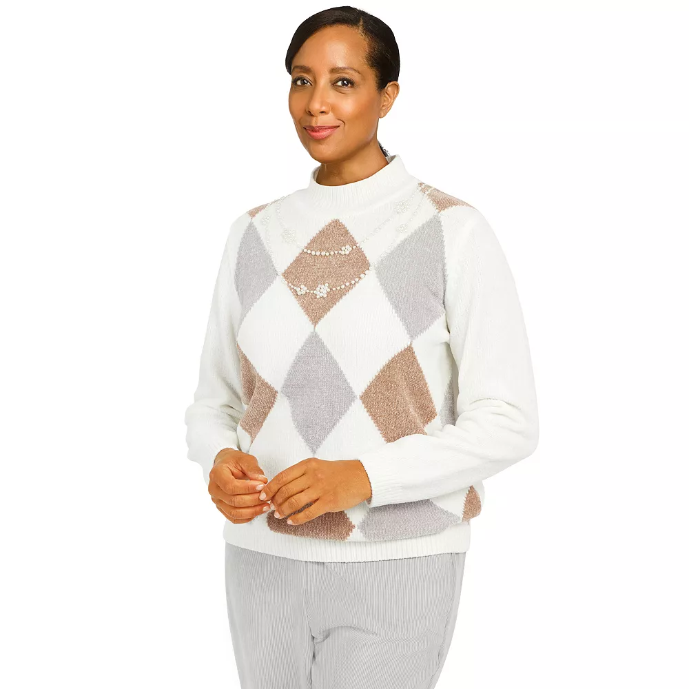 Feminine pearl beading creates a beautiful faux necklace on this women’s sweater from Alfred Dunner.