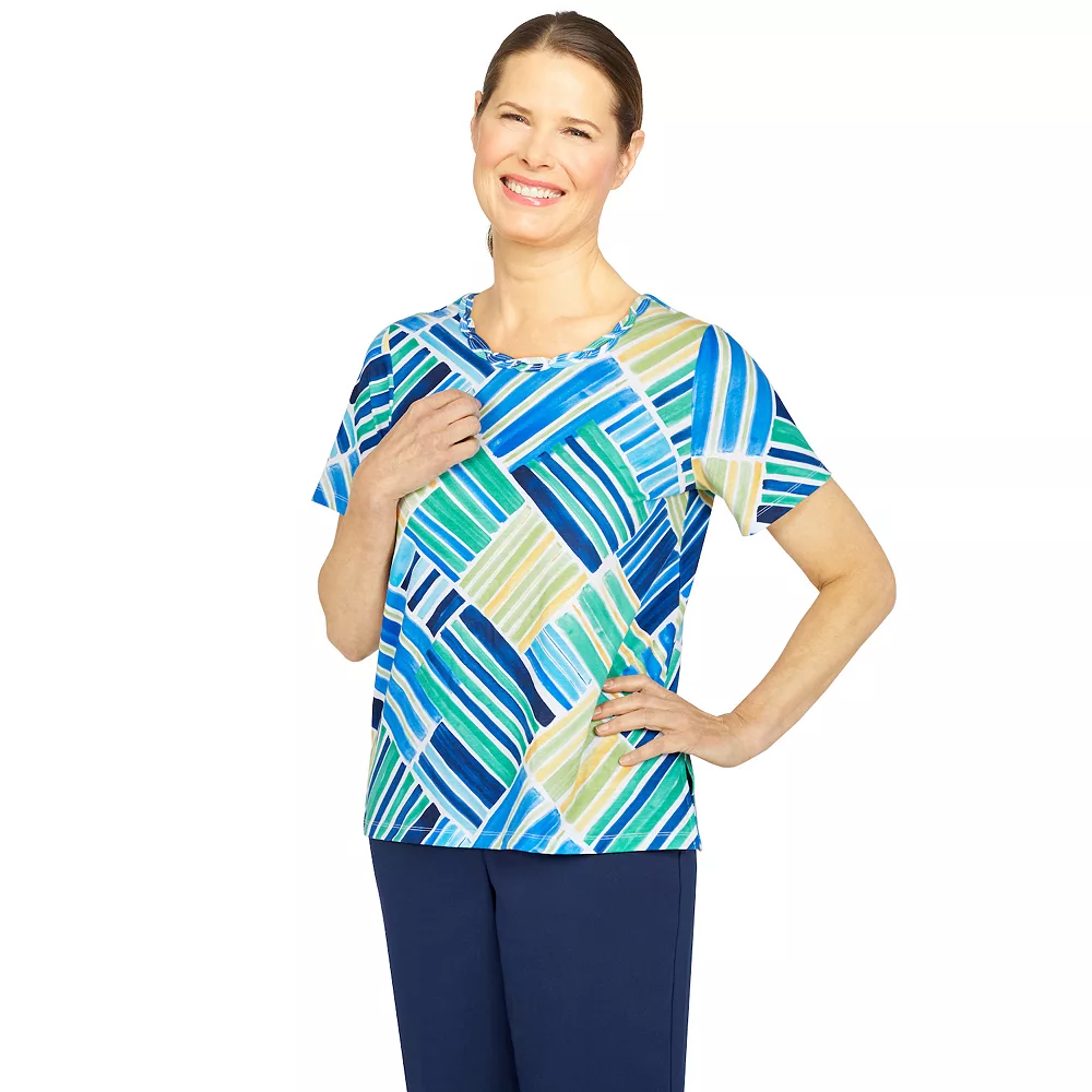 Watercolor stripes create an interesting patchwork print on this Alfred Dunner soft knit women’s top. The pretty embellishments at the braided crewneck lend a subtle sparkle.
