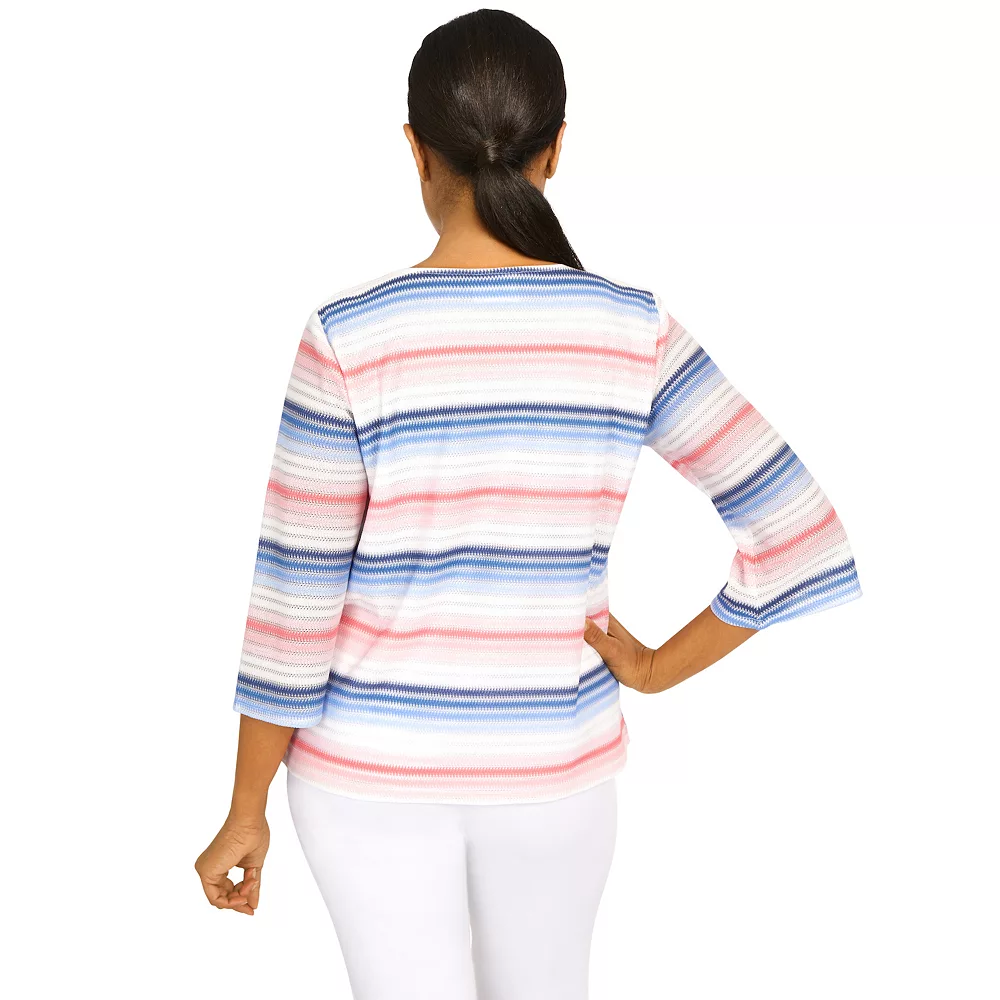 This knit top from Alfred Dunner features an ombre chevron stripe pattern in subdued red, white and blue.
