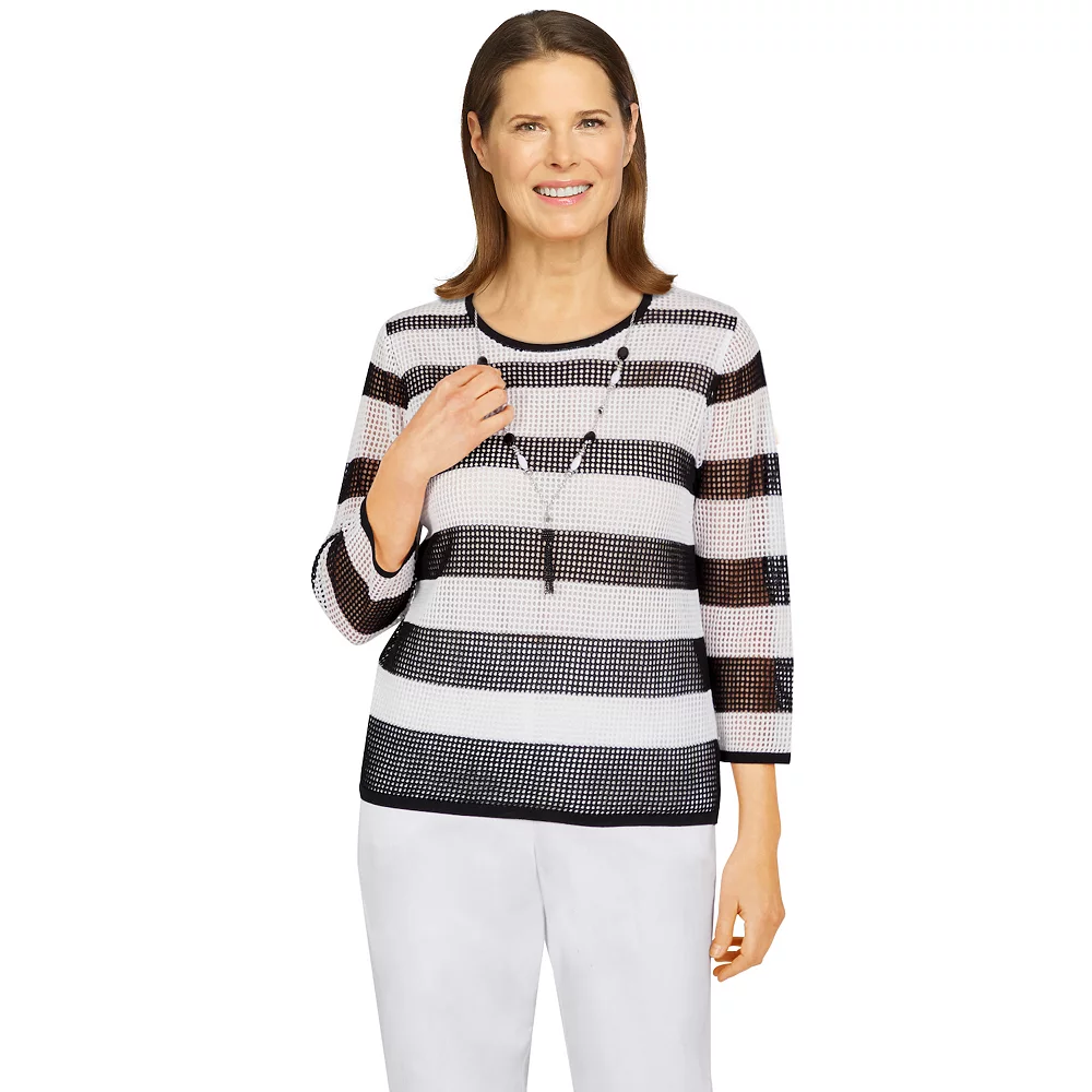 Bold stripes and open mesh stitching combine to make this body-lined women’s top from Alfred Dunner a chic staple for spring. Accessorize the removable necklace with all of your favorite tops!